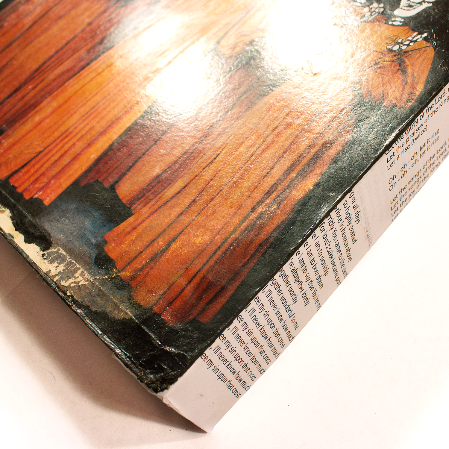 a vintage album cover mounted to wood with mixed media elements of prayer paper, ink, and acrylic paint.